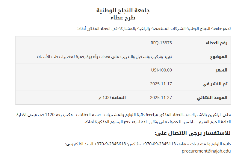 تدعو جامعة النجاح الوطنية الشركات المتخصصة والراغبة بالمشاركة في العطاء المذكور أدناه: