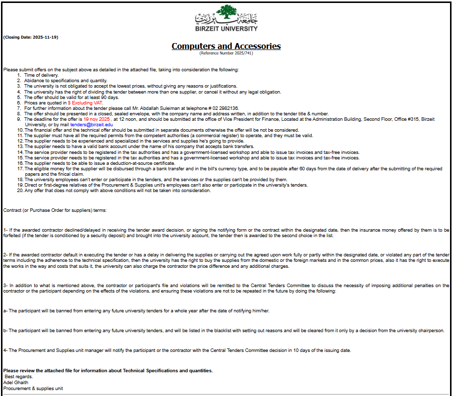 Please submit offers on the subject above as detailed in the attached file, taking into consideration the following: 1. Time of delivery. 2. Abidance to specifications and quantity. 3. The university is not obligated to accept the lowest prices, without giving any reasons or justifications. 4. The university has the right of dividing the tender between more than one supplier, or cancel it without any legal obligation. 5. The offer should be valid for at least 90 days. 6. Prices are quoted in $ Excluding VAT. 7. For further information about the tender please call Mr. Abdallah Suleiman at telephone # 02 2982136. 8. The offer should be presented in a closed, sealed envelope, with the company name and address written, in addition to the tender title & number. 9. The deadline for the offer is 19 nov 2025 , at 12 noon, and should be submitted at the office of Vice President for Finance, Located at the Administration Building, Second Floor, Office #315, Birzeit University, or by mail [email protected] 10. The financial offer and the technical offer should be submitted in separate documents otherwise the offer will be not be considered. 11. The supplier must have all the required permits from the competent authorities (a commercial register) to operate, and they must be valid. 12. The supplier needs to be experienced and specialized in the services and supplies he's going to provide. 13. The supplier needs to have a valid bank account under the name of his company that accepts bank transfers. 14. The service provider needs to be registered in the tax authorities and has a government-licensed workshop and able to issue tax invoices and tax-free invoices. 15. The service provider needs to be registered in the tax authorities and has a government-licensed workshop and able to issue tax invoices and tax-free invoices. 16. The supplier needs to be able to issue a deduction-at-source certificate. 17. The eligible money for the supplier will be disbursed through a bank transfer and in the bill's currency type, and to be payable after 60 days from the date of delivery after the submitting of the required papers and the finical claim. 18. The university employees can’t enter or participate in the tenders, and the services or the supplies can't be provided by them. 19. Direct or first-degree relatives of the Procurement & Supplies unit's employees can't also enter or participate in the university's tenders. 20. Any offer that does not comply with above conditions will not be taken into consideration.