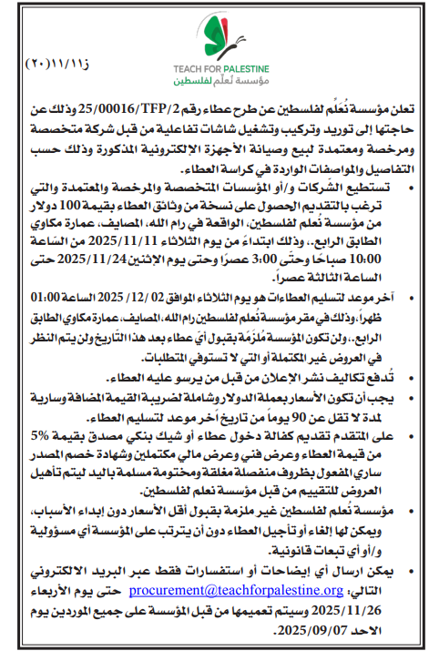 تعلن مؤسسة نعلم لفلسطين عن طرح عطاء رقم 2/TFP/25/00016 وذلك عن حاجتها إلى توريد وتركيب وتشغيل شاشات تفاعلية من قبل شركة متخصصة ومرخصة ومعتمدة لبيع وصيانة الأجهزة الإلكترونية المذكورة وذلك حسب التفاصيل والمواصفات الواردة في كراسة العطاء.