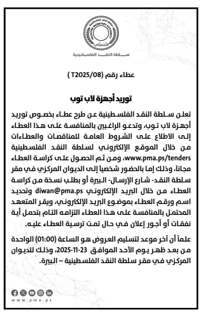 تعلن سلطة النقد الفلسطينية عن طرح عطاء بخصوص توريد أجهزة لاب توب، وتدعو الراغبين بالمنافسة على هذا العطاء إلى الاطلاع على الشروط العامة للمناقصات والعطاءات من خلال الموقع الإلكتروني لسلطة النقد الفلسطينية www.pma.ps/tenders، ومن ثم الحصول على كراسة العطاء مجاناً، وذلك إما بالحضور شخصياً إلى الديوان المركزي في مقر سلطة النقد- شارع الإرسال - البيرة أو بطلب نسخة من كراسة العطاء من خلال البريد الإلكتروني [email protected] وتحديد اسم ورقم العطاء بموضوع البريد الإلكتروني، ويقر المتعهد المحتمل بالمنافسة على هذا العطاء التزامه التام بتحمل أية