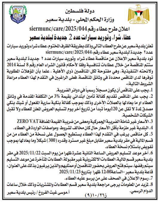 تعلن بلدية سعير عن طرح العطاء التالي وذلك بطريقة الظرف المختوم، عطاء شراء وتوريد سيارات عدد جديدة لبلدية سعير عطاء رقم : 2025/044/siermunc/care