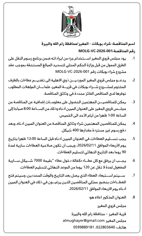يدعو مجلس قروي المغير الموردين ذوي الاهلية الى تقديم عطاءات بالظرف المختوم لمشروع شراء بوبكات في قرية المغير، علما بان المؤهلات المطلوب توفرها لدى المناقص الفائز محددة في وثائق المناقصة.
