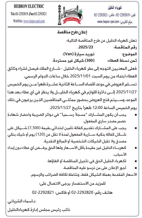 فعلى المعنيين التوجه إلى مقر كهرباء الخليل - شارع الملك فيصل لشراء وثائق - العطاء ابتداء من يوم السبت 2025/11/01 خلال ساعات الدوام الرسمي. تسلم العروض في موعد أقصاه الساعة الثانية عشرة ظهراً من يوم الخميس 2025/11/27 إلى دائرة اللوازم في كهرباء الخليل ولا ينظر في أي عطاء بعد هذا الموعد، وسيتم فتح العروض بحضور ممثلي المناقصين الذين يرغبون في ذلك - يوم الخميس الساعة 12:00 ظهراً بتاريخ 2025/11/27.