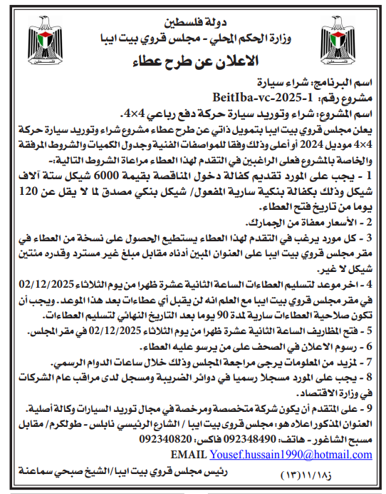 تعلن بلدية بيت أولا عن طرح عطاء شراء وتوريد عطاء شراء وتوريد سيارة بيك أب (Pickup Double Cabin 4x4) عدد (1) تبعا للشروط والمواصفات الموضحة في كراسة ووثائق العطاء، فعلى الشركات ذات الاختصاص والمسجلة رسميا وترغب في المشاركة في هذا العطاء مراجعة الدائرة المالية في بلدية بيت أولا على هاتف رقم (2581004-02) أو فاكس رقم (2581551-02)، وذلك خلال أوقات الدوام الرسمي من أجل الحصول على كراسة العطاء مقابل دفع مبلغ (300) شيكل غير مستردة تورد إلى صندوق البلدية، آخر موعد لقبول عروض الأسعار بالظرف المختوم في صندوق العطاءات في مقر بلدية بيت أولا حتى الساعة الثانية عشرة من ظهر الخميس الموافق 2025-11-27-م وتفتح المظاريف في نفس الزمان في مقر بلدية بيت أولا.
