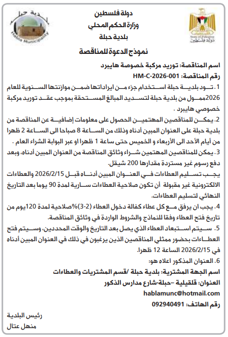 يمكن للمناقصين المهتمين الحصول على معلومات إضافية عن المناقصة من بلدية حبلة على العنوان المبين أدناه وذلك من الساعة 8 صباحا الى الساعة 2 ظهرا من أيام الأحد الى الأربعاء والخميس حتى ساعة 1 ظهرا او عبر البوابة الشراء العام .