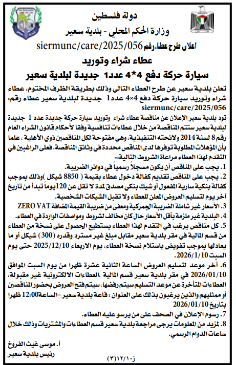 تعلن بلدية سعير عن طرح العطاء التالي وذلك بطريقة الظرف المختوم، عطاء شراء وتوريد سيارة حركة دفع 4x4 عدد 1 جديدة لبلدية سعير عطاء رقم: siermunc/care/2025/056