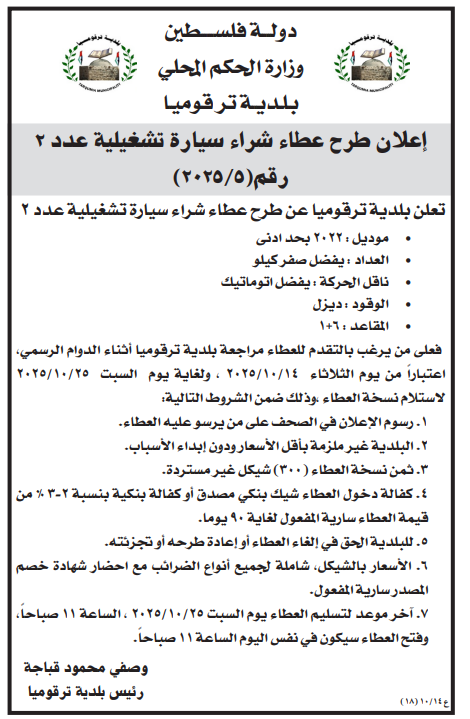 تعلن بلدية ترقوميا عن طرح عطاء شراء سيارة تشغيلية عدد ٢