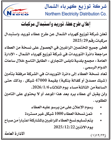 فعلى جميع المختصين الراغبين في الحصول على نسخة من العطاء مراجعة دائرة التوريدات في شركة توزيع كهرباء الشمال - الإدارة - العامة - مجمع بلدية نابلس التجاري - الطابق التاسع خلال ساعات الدوام الرسمي . تعاد نسخة العطاء إلى دائرة التوريدات في الشركة مرفقة بتأمين شيك مصدق أو كفالة بنكية) بقيمة 47000 شيكل ، وذلك حتى الساعة من الثالثة مساء يوم الثلاثاء 2026/1/6. ولن يقبل أي عطاء يرد بعد هذا الموعد أو لا يحتوي على التامين