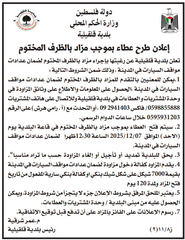 تعلن بلدية قلقيلية عن رغبتها بإجراء مزاد بالظرف المختوم لضمان عدادات مواقف السيارات في المدينة ، وذلك ضمن الشروط التالية :