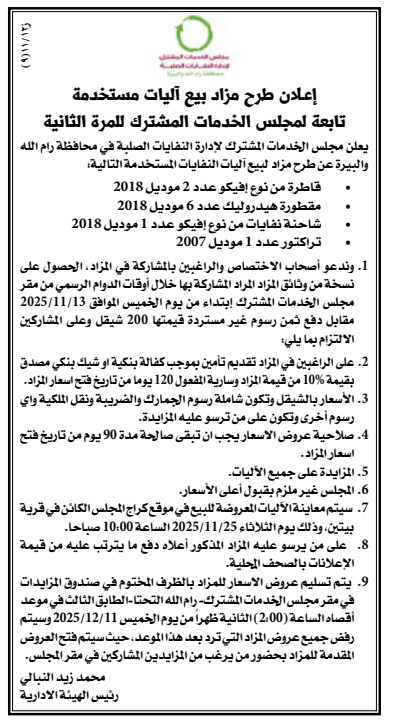 يعلن مجلس الخدمات المشترك لإدارة النفايات الصلبة في محافظة رام الله والبيرة عن طرح مزاد لبيع آليات النفايات المستخدمة التالية: قاطرة من نوع إفيكو عدد 2 موديل 2018 مقطورة هيدروليك عدد 6 موديل 2018 شاحنة نفايات من نوع افيكو عدد 1 موديل 2018 تراكتور عدد 1 موديل 2007
