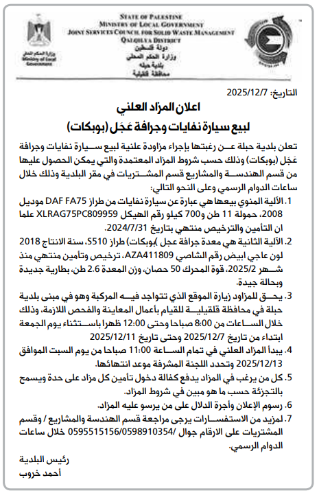 تعلن بلدية حبلة عن رغبتها بإجراء مزاودة علنية لبيع سيارة نفايات وجرافة عَجَل (بوبكات) وذلك حسب شروط المزاد المعتمدة والتي يمكن الحصول عليها من قسم الهندسة والمشاريع قسم المشتريات في مقر البلدية وذلك خلال ساعات الدوام الرسمي وعلى النحو التالي: