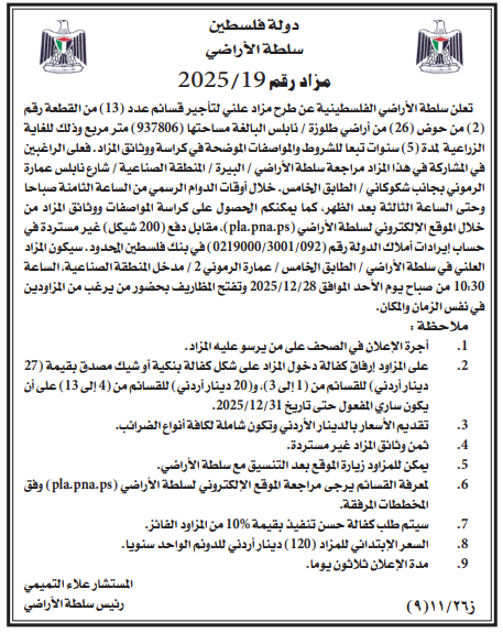 تعلن سلطة الأراضي الفلسطينية عن طرح مزاد علني لتأجير قسائم عدد (13) من القطعة رقم (2) من حوض (26) من أراضي طلوزة / نابلس البالغة مساحتها (937806) متر مربع وذلك للغاية الزراعية لمدة (5) سنوات تبعا للشروط والمواصفات الموضحة في كراسة ووثائق المزاد . فعلى الراغبين في المشاركة في هذا المزاد مراجعة سلطة الأراضي / البيرة / المنطقة الصناعية / شارع نابلس عمارة الرموني بجانب شكوكاني / الطابق الخامس خلال أوقات الدوام الرسمي من الساعة الثامنة صباحا وحتى الساعة الثالثة بعد الظهر، كما يمكنكم الحصول على كراسة المواصفات ووثائق المزاد من خلال الموقع الإلكتروني لسلطة الأراضي pla.pna.ps ، مقابل دفع 200 شيكل) غير مستردة في حساب إيرادات أملاك الدولة رقم (0219000/3001/092) في بنك فلسطين المحدود. سيكون المزاد العلني في سلطة الأراضي / الطابق الخامس / عمارة الرموني 2 / مدخل المنطقة الصناعية، الساعة 10:30 من صباح يوم الأحد الموافق 2025/12/28 وتفتح المظاريف بحضور من يرغب من المزاودين في نفس الزمان والمكان.