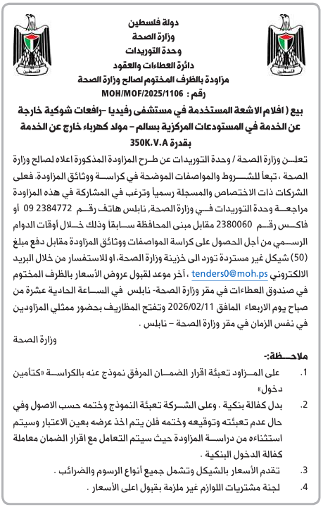 تعلن وزارة الصحة / وحدة التوريدات عن طرح المزاودة المذكورة اعلاه لصالح وزارة الصحة ، تبعاً للشروط والمواصفات الموضحة في كراسة ووثائق المزاودة. فعلى الشركات ذات الاختصاص والمسجلة رسمياً وترغب في المشاركة في هذه المزاودة مراجعة وحدة التوريدات في وزارة الصحة نابلس هاتف رقم 2384772 09 أو فاكس رقم 2380060 مقابل مبنى المحافظة سابقاً وذلك خلال أوقات الدوام الرسمي من أجل الحصول على كراسة المواصفات ووثائق المزاودة مقابل دفع مبلغ (50) شيكل غير مستردة تورد الى خزينة وزارة الصحة او للاستفسار من خلال البريد الالكتروني [email protected] ، آخر موعد لقبول عروض الأسعار بالظرف المختوم في صندوق العطاءات في مقر وزارة الصحة - نابلس في الساعة الحادية عشرة من صباح يوم الاربعاء المافق 2026/02/11 وتفتح المظاريف بحضور ممثلي المزاودين في نفس الزمان في مقر وزارة الصحة - نابلس .