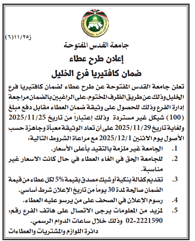 تعلن جامعة القدس المفتوحة عن طرح عطاء لضمان كافتيريا فرع الخليل وذلك عن طريق الظرف المختوم، على الراغبين بالضمان مراجعة إدارة الفرع وذلك للحصول على وثيقة ضمان العطاء مقابل دفع مبلغ (100) شيكل غير مستردة وذلك إعتباراً من تاريخ 2025/11/25 ولغاية تاريخ 2025/11/29 على أن تعاد الوثيقة معبأة وجاهزة . الأصول يوم الاثنين 2025/12/11 مع مراعاة الشروط التالية: