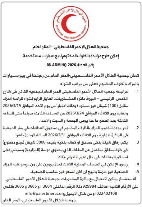 تعلن بلدية الخليل عن رغبتها باجراء مزايدة بالظرف المختوم لضمان ارض البلدية بالقرب من دائرة السيركموقف عام مدفوع الاجر ( 29 2025 HMED) فعلى الراغبين في المزايدة على الموقف، التوجه الى دائرة العطاءات والتوريدات في البلدية اثناء الدوام الرسمي. وفقا للشروط التالية