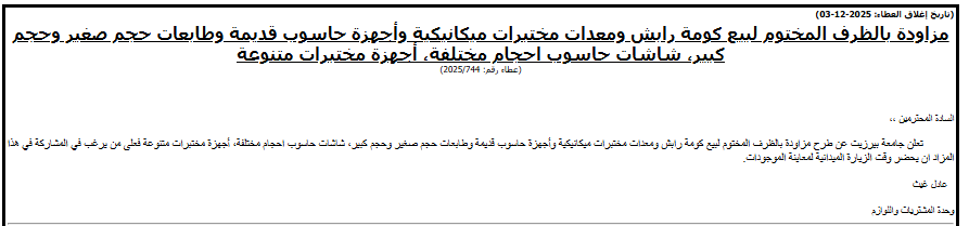 | مزاودة بالظرف المختوم لبيع كومة رابش ومعدات مختبرات ميكانيكية وأجهزة حاسوب قديمة وطابعات حجم صغير وحجم كبير، شاشات حاسوب احجام مختلفة، أجهزة مختبرات متنوعة (عطاء رقم: 2025/744) |