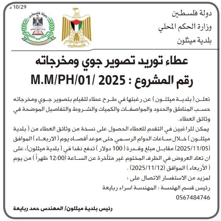 تعلن ( بلدية ميثلون ) عن رغبتها في طرح عطاء للقيام بتصوير جوي ومخرجاته حسب المناطق والحدود والمواصفات والكميات والشروط والتفاصيل الموضحة في وثائق العطاء.