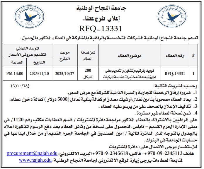 تدعو جامعة النجاح الوطنية الشركات المتخصصة والراغبة بالمشاركة في العطاء المذكور بالجدول