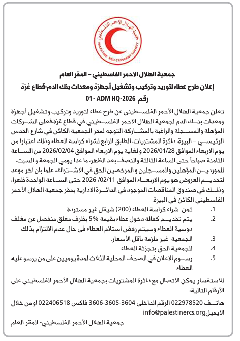 تعلن جمعية الهلال الأحمر الفلسطيني عن طرح عطاء لتوريد وتركيب وتشغيل أجهزة ومعدات بنك الدم لجمعية الهلال الاحمر الفلسطيني في قطاع غزة فعلى الشركات المؤهلة والمسجلة والراغبة بالمشاركة التوجه لمقر الجمعية الكائن في شارع القدس الرئيسي - البيرة، دائرة المشتريات، الطابق الرابع لشراء كراسة العطاء وذلك اعتباراً من يوم الاربعاء الموافق 2026/01/28 ولغاية يوم الاربعاء الموافق 2026/02/04 من | الثامنة صباحاً حتى الساعة الثالثة والنصف بعد الظهر، ما عدا يومي الجمعة و السبت. للموردين المؤهلين والمسجلين والمرخصين الحق في الاشتراك، علما بان آخر موعد لتقديم العروض هو يوم الاربعاء الموافق 2026/02/11 حتى الساعة الواحدة ظهرا وذلك في صندوق المناقصات الموجود في الدائرة الادارية بمقر جمعية الهلال الأحمر الفلسطيني الكائن في البيرة.