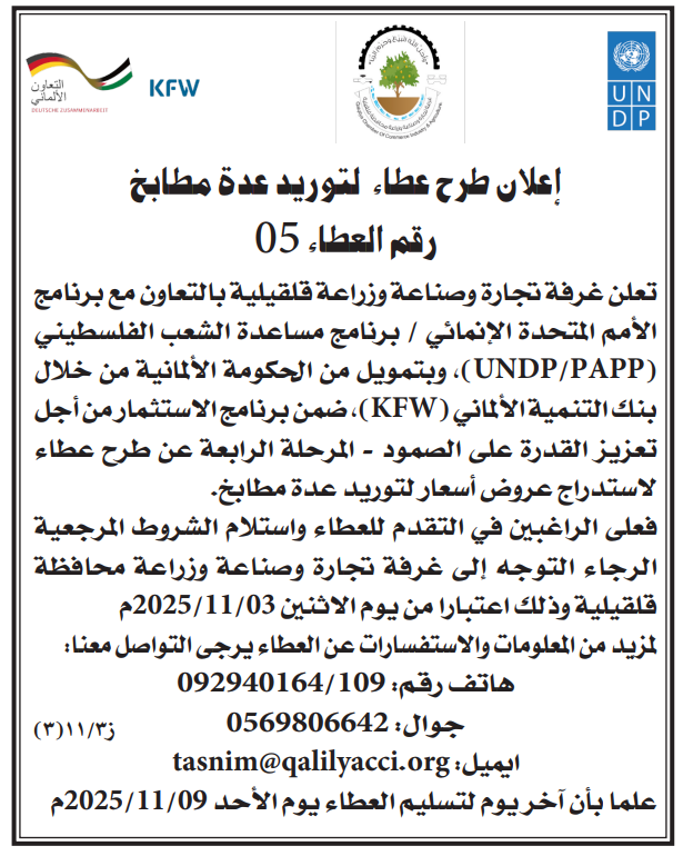 تعلن غرفة تجارة وصناعة وزراعة قلقيلية بالتعاون مع برنامج الأمم المتحدة الإنمائي / برنامج مساعدة الشعب الفلسطيني (UNDP/PAPP)، وبتمويل من الحكومة الألمانية من خلال بنك التنمية الألماني (KFW)، ضمن برنامج الاستثمار من أجل تعزيز القدرة على الصمود - المرحلة الرابعة عن طرح عطاء لاستدراج عروض أسعار لتوريد عدة مطابخ. فعلى الراغبين في التقدم للعطاء واستلام الشروط المرجعية الرجاء التوجه إلى غرفة تجارة وصناعة وزراعة محافظة قلقيلية وذلك اعتبارا من يوم الاثنين 2025/11/03م لمزيد من المعلومات والاستفسارات عن العطاء يرجى التواصل معنا: هاتف رقم: 092940164/109 جوال: 0569806642 ایمیل: [email protected]