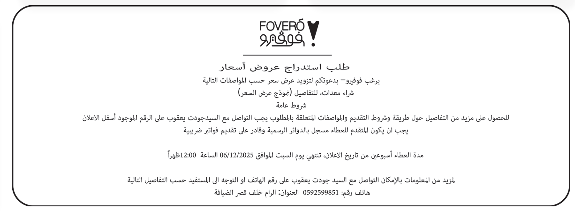 يرغب فوفيرو- بدعوتكم لتزويد عرض سعر حسب المواصفات التالية