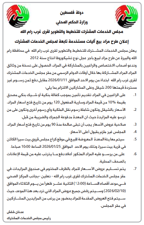 يعلن مجلس الخدمات المشترك للتخطيط والتطوير لقرى غرب رام الله في محافظة رام الله والبيرة عن طرح مزاد لبيع باجر عجل نوع تشيكوروفا انتاج سنة 2012، وندعو أصحاب الاختصاص والراغبين بالمشاركة في المزاد الحصول على نسخة من وثائق المزاد المراد المشاركة بها خلال أوقات الدوام الرسمي من مقر مجلس الخدمات المشترك لقرى غرب رام الله ابتداء من يوم الاحد الموافق 2026/01/11 مقابل دفع ثمن رسوم غير مستردة قيمتها 200 شيقل وعلى المشاركين الالتزام بما يلي: