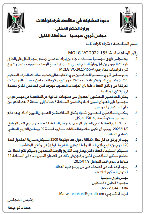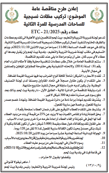 تدعو لجنة ضريبة التربية والتعليم - بيت لحم المناقصين ذوي الأهلية الى تقديم عطاءات بالظرف المختوم لتنفيذ أعمال تركيب مظلات نسيجية للساحات المدرسية للمرة الثانية وذلك في موعد أقصاه الساعة 11:00 صباحاً من يوم الاثنين 2025/11/10م، ويتم التسليم في مكتب لجنة ضريبة التربية والتعليم - بلدية بيت لحم ولن يُقبل بعدها أي عطاء لأي سبب كان، على أن يتم مراعاة ما يلي عند تقديم المناقصة: