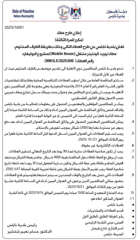 تعلن بلدية نابلس عن طرح العطاء التالي وذلك بطريقة الظرف المختوم عطاء توريد كونتينر متنقل (Mobile House) لمشروع البوليفارد رقم العطاء ( 2025/040/NM/G.E)