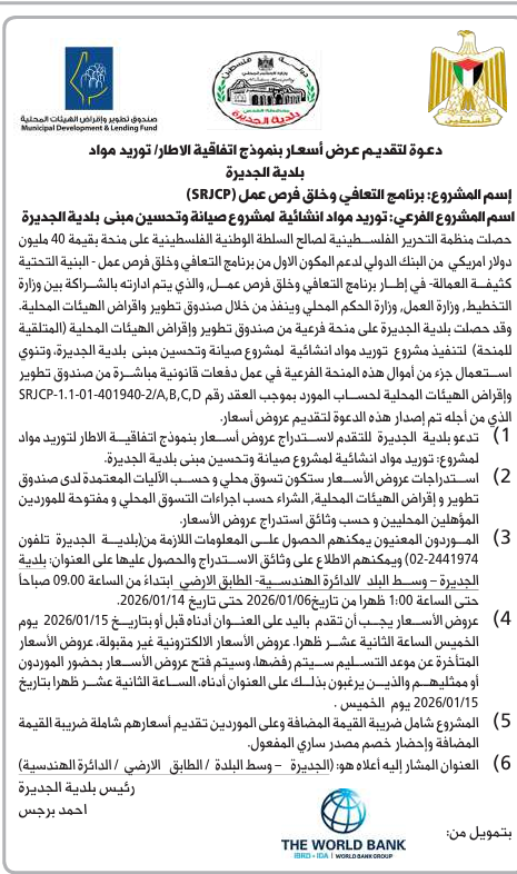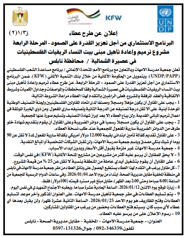 تعلن جمعية مدرسة الامهات وبالتعاون مع برنامج الأمم المتحدة الإنمائي / برنامج مساعدة الشعب الفلسطيني (UNDP/PAPP)، وبتمويل من الحكومة الألمانية من خلال بنك التنمية الألماني (KFW)، ضمن البرنامج الاستثماري من أجل تعزيز القدرة على الصمود - المرحلة الرابعة، عن طرح عطاء ترميم وإعادة تأهيل مبنى بيت النساء الريفيات الفلسطينيات في عصيرة الشمالية وفقا للمخططات والمواصفات وجداول الكميات وشروط الاتفاقية والعقد المرفقة بالمشروع، فعلى الراغبين بالتقدم لهذا العطاء مراعاة الشروط التالية: