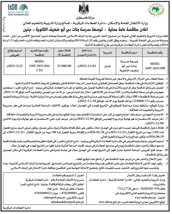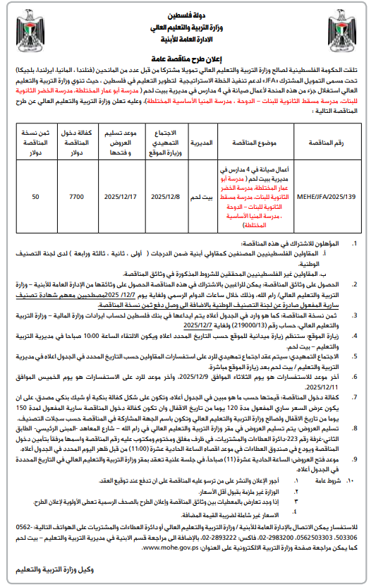 تلقت الحكومة الفلسطينية لصالح وزارة التربية والتعليم العالي تمويلا مشتركا من قبل عدد من المانحين (فنلندا ، المانيا، ايرلندا، بلجيكا) تحت مسمى التمويل المشترك :JFA لدعم تنفيذ الخطة الاستراتيجية لتطوير التعليم في فلسطين، حيث تنوي وزارة التربية والتعليم العالي استغلال جزء من هذه المنحة الأعمال صيانة في 4 مدارس في مديرية ببيت لحم ( مدرسة أبو عمار المختلطة، مدرسة الخضر الثانوية للبنات، مدرسة مسقط الثانوية للبنات - الدوحة ، مدرسة المنيا الأساسية المختلطة)، وعليه تعلن وزارة التربية والتعليم العالي عن طرح المناقصة التالية :