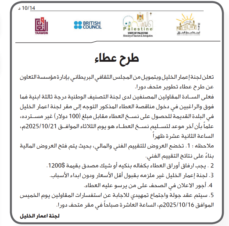 فعلى السادة المقاولين المصنفين لدى لجنة التصنيف الوطنية درجة ثالثة ابنية فما فوق والراغبين في دخول مناقصة العطاء المذكور التوجه إلى مقر لجنة اعمار الخليل في البلدة القديمة للحصول على نسخ العطاء مقابل مبلغ 100 دولار) غير مسترده، علما بأن آخر موعد لتسليم نسخ العطاء هو يوم الثلاثاء الموافق 2025/10/21م، الساعة الثانية عشرة ظهراً
