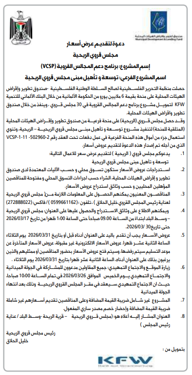 - يمكنهم الاطلاع على وثائق الاستدراج والحصول عليها على العنوان: مجلس قروي الريحية - وسط البلد ابتداء من الساعة 09.00 صباحاً حتى الساعة 1:00 ظهرا من تاريخ 2026/03/17 حتى تاريخ 2026/03/30.