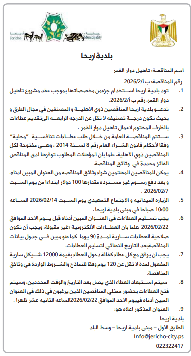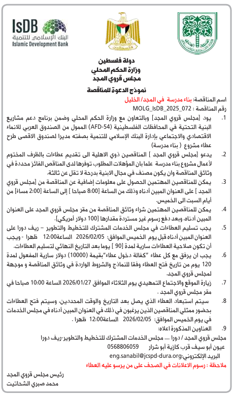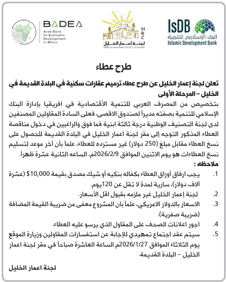 بتخصيص من المصرف العربي للتنمية الاقتصادية في افريقيا بإدارة البنك الإسلامي للتنمية بصفته مديراً لصندوق الاقصى، فعلى السادة المقاولين المصنفين لدى لجنة التصنيف الوطنية درجة ثالثة ابنية فما فوق والراغبين في دخول مناقصة العطاء المذكور التوجه إلى مقر لجنة اعمار الخليل في البلدة القديمة للحصول على نسخ العطاء مقابل مبلغ 250 دولار) غير مستردة للعطاء، علماً بأن آخر موعد لتسليم نسخ العطاءات هو يوم الاثنين الموافق 2026/2/9م الساعه الثانية عشرة ظهراً. ملاحظات: