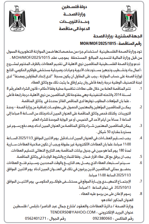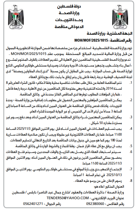 وزارة الصحة / دائرة العطاءات والعقود شارع جمال عبد الناصر/نابلس / فلسطين