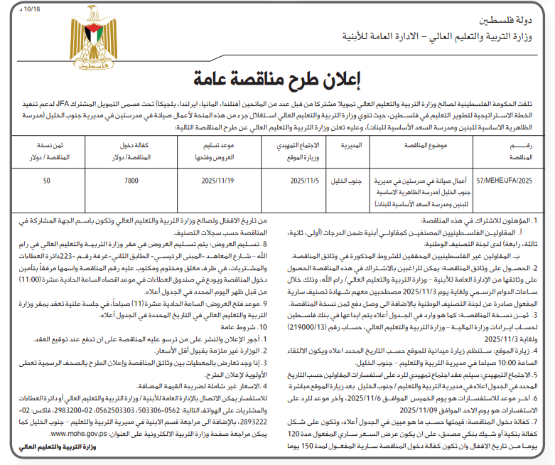 تلقت الحكومة الفلسطينية لصالح وزارة التربية والتعليم العالي تمويلا مشتركا من قبل عدد من المانحين (فنلندا، المانيا، ايرلندا، بلجيكا) تحت مسمى التمويل المشترك JFA لدعم تنفيذ الخطة الاستراتيجية لتطوير التعليم في فلسطين، حيث تنوي وزارة التربية والتعليم العالي استغلال جزء من هذه المنحة الأعمال صيانة في مدرستين في مديرية جنوب الخليل (مدرسة الظاهرية الاساسية للبنين ومدرسة السعد الأساسية للبنات)، وعليه تعلن وزارة التربية والتعليم العالي عن طرح المناقصة التالية: