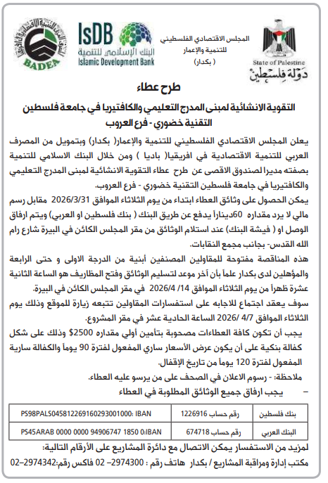 يعلن المجلس الاقتصادي الفلسطيني للتنمية والإعمار ( بكدار ) وبتمويل من المصرف العربي للتنمية الاقتصادية في افريقيا ( باديا ) ومن خلال البنك الاسلامي للتنمية بصفته مديرا لصندوق الاقصى عن طرح عطاء التقوية الانشائية لمبنى المدرج التعليمي والكافتيريا في جامعة فلسطين التقنية خضوري - فرع العروب.