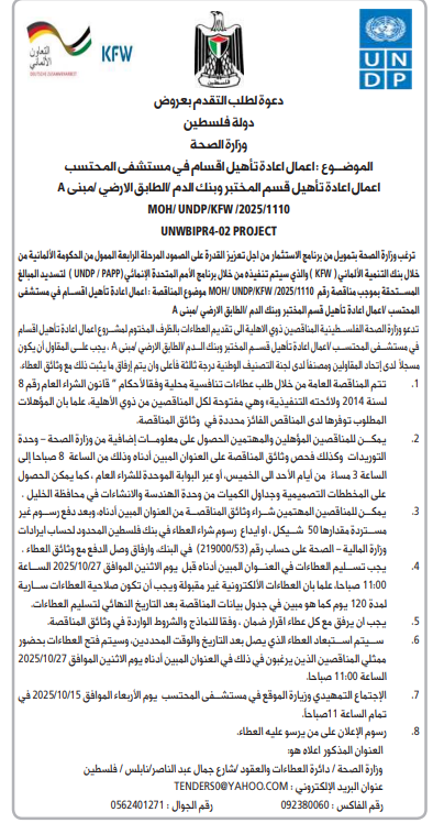 ترغب وزارة الصحة بتمويل من برنامج الاستثمار من اجل تعزيز القدرة على الصمود المرحلة الرابعة الممول من الحكومة الألمانية من خلال بنك التنمية الألماني ( KPW ) والذي سيتم تنفيذه من خلال برنامج الأمم المتحدة الإنمائي (UNDP / PAPP ) لتسديد المبالغ المستحقة بموجب مناقصة رقم 2025/1110/ MOH/ UNDP/KFW موضوع المناقصة : اعمال اعادة تأهيل اقسام في مستشفى المحتسب اعمال اعادة تأهيل قسم المختبر وبنك الدم الطابق الارضي مبنى A