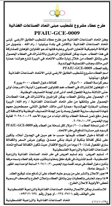 يعلن اتحاد الصناعات الغذائية عن طرح عطاء تشطيب الطابق الأرضي لمبنى اتحاد الصناعات الغذائية والكائن في بلدة بيتونيا / رام الله ، بتمويل من الوكالة البلجيكية للتعاون الدولي وعليه فإنها تدعو المقاولين المؤهلين للمشاركة في هذا العطاء. حيث يمكن للمقاولين الراغبين بالاشتراك في العطاء الحصول على وثائق العطاء من خلال زيارة مكتب الاتحاد في البيرة شارع هولندا عمارة