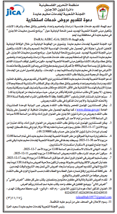 اسم المهمة تقديم خدمات هندسية (دراسات وتصاميم وإعداد وتحضير وثائق عطاء وإشراف ) لإنشاء وتأهيل مبنى اللجنة الشعبية الجديد ضمن المنحة اليابانية حول " برنامج تحسين مخيمات اللاجئين " في مخيم عايدة في محافظة بيت لحم