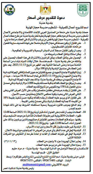 حصلت بلدية عنبتا على منحة من الصندوق العربي للإنماء الاقتصادي والاجتماعي لأعمال تشطيب مبنى مدرسة المرحوم طاهر حجاز المهنية وعليه تعلن بلدية عنبتا عن طرح عطاء أعمال تكميلية - تشطيب مدرسة حجاز المهنية فعلى من يرغب بالاشتراك في العطاء مراعاة ما يلي: