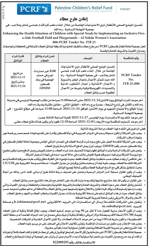 تعلن جمعية إغاثة أطفال فلسطين (PCRF ) عن طرح عطاء بالظرف المختوم وذلك وفقا لوثائق العطاء المتمثلة في المخططات والمواصفات وجداول الكميات والشروط العامة والخاصة