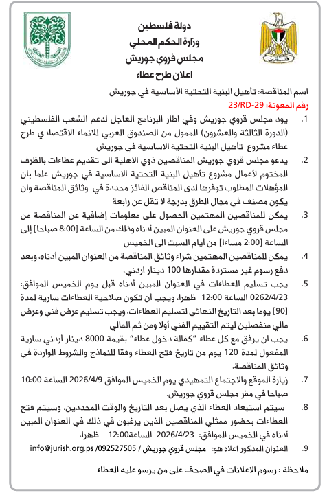 - المناقصون المعنيون يمكنهم الحصول على المعلومات اللازمة من مجلس قروي الريحية العناية رئيس المجلس القروي خليل الحلاق ، تلفون: (0599661162 ) / فاكس: (272888022)