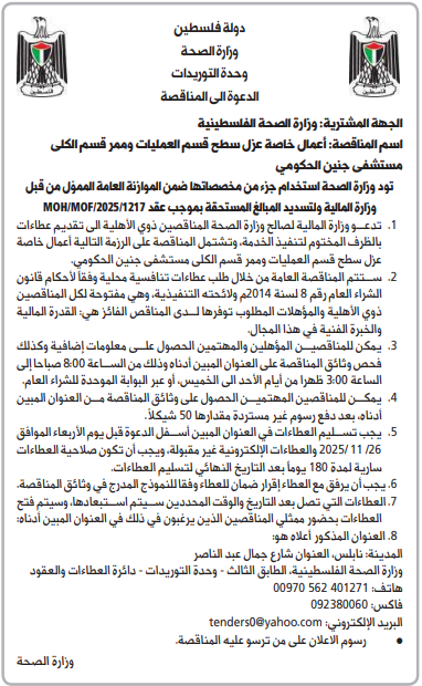 الجهة المشترية: وزارة الصحة الفلسطينية اسم المناقصة: أعمال خاصة عزل سطح قسم العمليات وممر قسم الكلى مستشفى جنين الحكومي