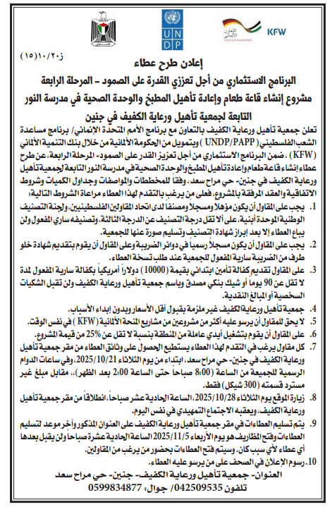 تعلن جمعية تأهيل ورعاية الكفيف بالتعاون مع برنامج الأمم المتحدة الإنمائي / برنامج مساعدة الشعب الفلسطيني ( UNDP/PAPP ) وبتمويل من الحكومة الألمانية من خلال بنك التنمية الألماني (KFW) ، ضمن البرنامج الاستثماري من أجل تعزيز القدر على الصمود - المرحلة الرابعة عن طرح عطاء إنشاء قاعة طعام وإعادة تأهيل المطبخ والوحدة الصحية في مدرسة النور التابعة لجمعية تأهيل ورعاية الكفيف في جنين - حي مراح سعد، وفقا للمخططات والمواصفات وجداول الكميات وشروط