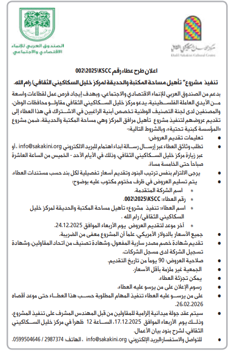 . بدعم من الصندوق العربي للإنماء الاقتصادي والاجتماعي، وبهدف إيجاد فرص عمل لقطاعات واسعة من الأيدي العاملة الفلسطينية، يدعو مركز خليل السكاكيني الثقافي مقاولو محافظات الوطن والمصنفين لدى لجنة التصنيف الوطنية تخصص أبنية الراغبين في الاشتراك في هذا العطاء إلى تقديم عروضهم لتنفيذ مشروع تأهيل مرافق المركز وهي مساحة المكتبة والحديقة، ضمن مشروع «المؤسسة كبنية تحتية»، وبالشروط التالية: