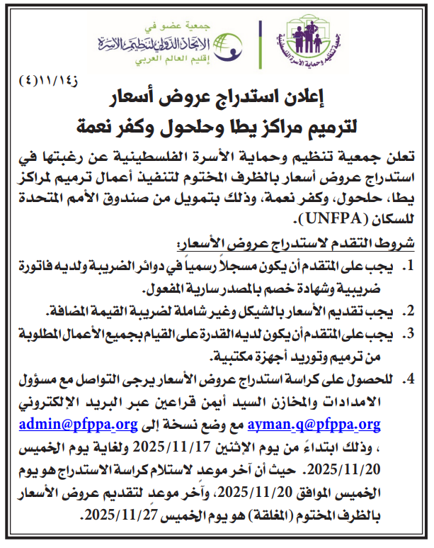 تعلن جمعية تنظيم وحماية الأسرة الفلسطينية عن رغبتها في استدراج عروض أسعار بالظرف المختوم لتنفيذ أعمال ترميم لمراكز يطا، حلحول، وكفر نعمة، وذلك بتمويل من صندوق الأمم المتحدة للسكان (UNFPA).