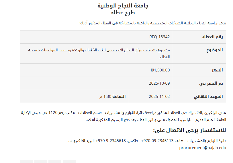 تدعو جامعة النجاح الوطنية الشركات المتخصصة والراغبة بالمشاركة في العطاء المذكور أدناه: