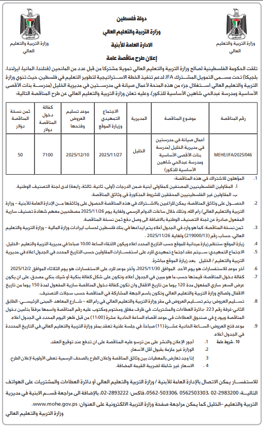 تلقت الحكومة الفلسطينية لصالح وزارة التربية والتعليم العالي تمويلا مشتركا من قبل عدد من المانحين (فنلندا، المانيا، ايرلندا، بلجيكا) تحت مسمى التمويل المشترك JFA لدعم تنفيذ الخطة الاستراتيجية لتطوير التعليم في فلسطين، حيث تنوي وزارة التربية والتعليم العالي استغلال جزء من هذه المنحة الأعمال صيانة في مدرستين في مديرية الخليل (مدرسة بنات الأقصى الأساسية ومدرسة عبد الحي شاهين الأساسية للذكور)، وعليه تعلن وزارة التربية والتعليم العالي عن طرح المناقصة التالية:كفالة