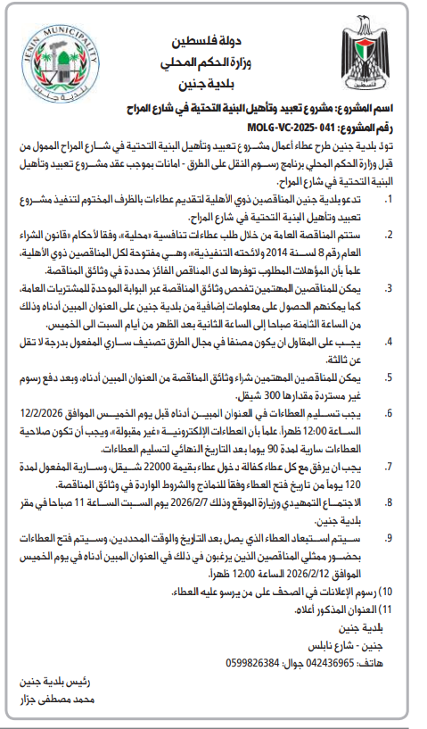 يمكن للمناقصين المهتمين تفحص وثائق المناقصة عبر البوابة الموحدة للمشتريات العامة كما يمكنهم الحصول على معلومات إضافية من بلدية جنين على العنوان المبين أدناه وذلك من الساعة الثامنة صباحا إلى الساعة الثانية بعد الظهر من أيام السبت الى الخميس.