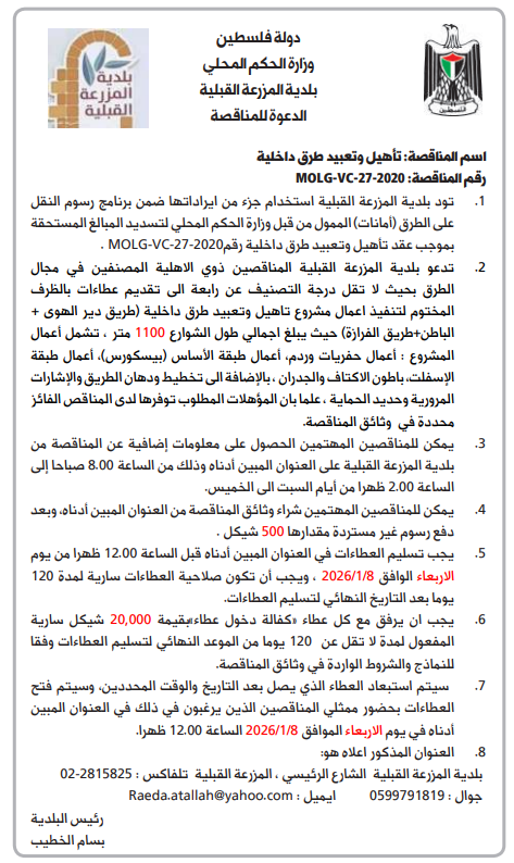 إسم المناقصة : تأهيل وتعبيد طرق داخلية رقم المناقصة : 2020-27-MOLG-VC
